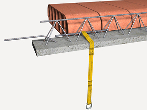 Dispositivo de anclaje para empotrar en techo, de 1310 mm de longitud, formado por cinta de poliéster; 1 gaza en un extremo y 1 argolla en el otro extremo, fijado, por el extremo de la gaza y antes del vaciado, a una barra corrugada de acero Grado 60 (fy=4200 kg/cm²) embebida en la vigueta de la estructura de concreto armado, de 10 mm de diámetro mínimo y 300 mm de longitud mínima, para asegurar a un operario. | ||