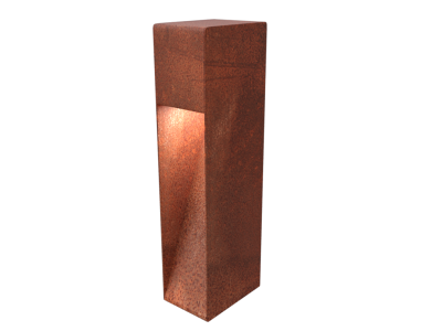 Baliza de 1100 mm de altura, compuesta por cuerpo de acero corten de 6 mm de espesor y reflector inclinado de acero inoxidable AISI 304, con 3 led de 25 W, clase de protección I, grado de protección IP66, fijada a una base de concreto f'c=210 kg/cm² (3000 psi), clase de exposición F0 S0 P0 C0, tamaño máximo del agregado 25 mm (1" ASTM Nº 57), consistencia plástica. Incluso elementos de anclaje.