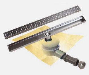 Kit Lineal Basic Squares 50 "REVESTECH", formado por lámina impermeabilizante flexible tipo EVAC Dry40 de 250x250 mm, con unión termosellada a la parrilla sifónico de PVC de 60 mm de altura, salida horizontal de 40 mm de diámetro, con rejilla para empotrar de acero inoxidable, modelo Cuadros de 498x57 mm, canaleta de drenaje de acero inoxidable, de 500x61 mm y lámina impermeabilizante flexible tipo EVAC Dry40 de 1500x2000 mm compuesta de una doble hoja de poliolefina termoplástica con acetato de vinil etileno, con ambas caras revestidas de fibras de poliéster no tejidas, de 0,48 mm de espesor y 290 g/m², para impermeabilización y desagüe de ducha de obra.